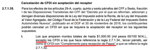 De manera específica, se modificó el inciso I de la regla 2.7.1.35 de la Resolución Miscelánea Fiscal, excluyendo expresamente a los CFDI con Complemento de Recepción de Pagos del supuesto que permitía su cancelación sin la aceptación del receptor.